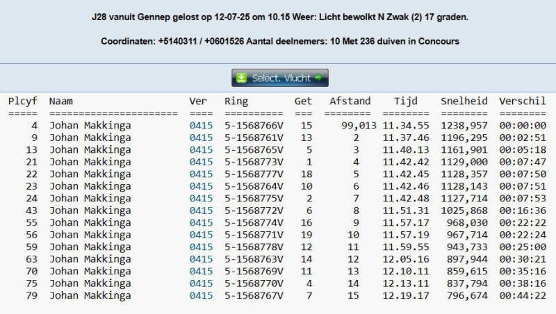 18 van de 19 duiven op de club uitslag. Spek en bonen vluchtje maar toch een teken dat de duiven gezond en goed zijn.